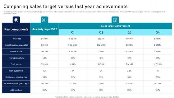 This slide provides glimpse about analyzing the target achievements of the sales team that help our business to assess current performance and efficiency rates. It includes KPIs such as targets achieved, revenue generated, products sold, etc. Slidegeeks is here to make your presentations a breeze with Comparing Sales Target Versus Last Year Strategic Sales Plan To Enhance Infographics Pdf With our easy-to-use and customizable templates, you can focus on delivering your ideas rather than worrying about formatting. With a variety of designs to choose from, you are sure to find one that suits your needs. And with animations and unique photos, illustrations, and fonts, you can make your presentation pop. So whether you are giving a sales pitch or presenting to the board, make sure to check out Slidegeeks first. This slide provides glimpse about analyzing the target achievements of the sales team that help our business to assess current performance and efficiency rates. It includes KPIs such as targets achieved, revenue generated, products sold, etc.