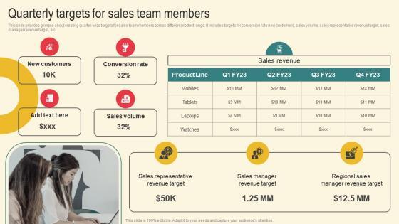 This slide provides glimpse about creating quarter-wise targets for sales team members across different product range. It includes targets for conversion rate new customers, sales volume, sales representative revenue target, sales manager revenue target, etc. Whether you have daily or monthly meetings, a brilliant presentation is necessary. Quarterly Targets For Sales Team Planning Outreach Campaigns PPT Example can be your best option for delivering a presentation. Represent everything in detail using Quarterly Targets For Sales Team Planning Outreach Campaigns PPT Example and make yourself stand out in meetings. The template is versatile and follows a structure that will cater to your requirements. All the templates prepared by Slidegeeks are easy to download and edit. Our research experts have taken care of the corporate themes as well. So, give it a try and see the results. This slide provides glimpse about creating quarter-wise targets for sales team members across different product range. It includes targets for conversion rate new customers, sales volume, sales representative revenue target, sales manager revenue target, etc.