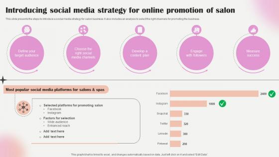 This slide presents the steps to introduce a social media strategy for salon business. It also includes an analysis to select the right channels for promoting the business. Find a pre-designed and impeccable Salon Marketing Plan To Optimize Introducing Social Media Strategy For Online Strategy SS V. The templates can ace your presentation without additional effort. You can download these easy-to-edit presentation templates to make your presentation stand out from others. So, what are you waiting for Download the template from Slidegeeks today and give a unique touch to your presentation. This slide presents the steps to introduce a social media strategy for salon business. It also includes an analysis to select the right channels for promoting the business.