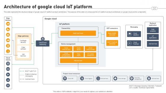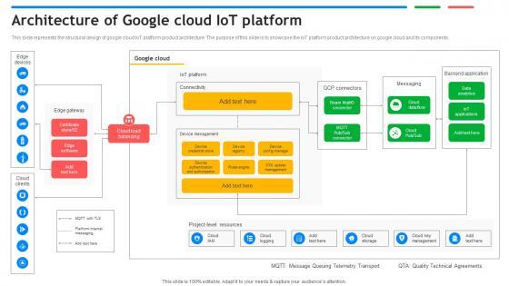 This slide represents the structural design of google cloud IoT platform product architecture. The purpose of this slide is to showcase the IoT platform product architecture on google cloud and its components. Welcome to our selection of the Architecture Of Google Cloud IOT Platform Aws IOT Platform Ppt Template These are designed to help you showcase your creativity and bring your sphere to life. Planning and Innovation are essential for any business that is just starting out. This collection contains the designs that you need for your everyday presentations. All of our PowerPoints are 100Percent editable, so you can customize them to suit your needs. This multi-purpose template can be used in various situations. Grab these presentation templates today. This slide represents the structural design of google cloud IoT platform product architecture. The purpose of this slide is to showcase the IoT platform product architecture on google cloud and its components.