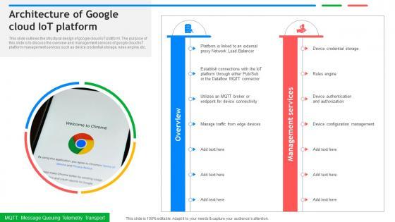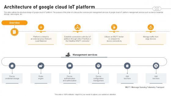 This slide outlines the structural design of google cloud IoT platform. The purpose of this slide is to discuss the overview and management services of google cloud IoT platform management services such as device credential storage, rules engine, etc. There are so many reasons you need a Architecture Of Google Cloud IoT Platform Exploring Google Cloud IoT Platform The first reason is you can not spend time making everything from scratch, Thus, Slidegeeks has made presentation templates for you too. You can easily download these templates from our website easily. This slide outlines the structural design of google cloud IoT platform. The purpose of this slide is to discuss the overview and management services of google cloud IoT platform management services such as device credential storage, rules engine, etc.