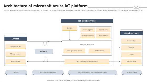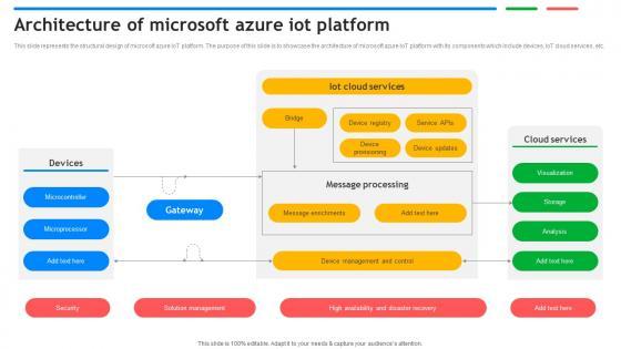 This slide represents the structural design of microsoft azure IoT platform. The purpose of this slide is to showcase the architecture of microsoft azure IoT platform with its components which include devices, IoT cloud services, etc. Explore a selection of the finest Architecture Of Microsoft Azure IOT Platform Aws IOT Platform Ppt Template here. With a plethora of professionally designed and pre-made slide templates, you can quickly and easily find the right one for your upcoming presentation. You can use our Architecture Of Microsoft Azure IOT Platform Aws IOT Platform Ppt Template to effectively convey your message to a wider audience. Slidegeeks has done a lot of research before preparing these presentation templates. The content can be personalized and the slides are highly editable. Grab templates today from Slidegeeks. This slide represents the structural design of microsoft azure IoT platform. The purpose of this slide is to showcase the architecture of microsoft azure IoT platform with its components which include devices, IoT cloud services, etc.