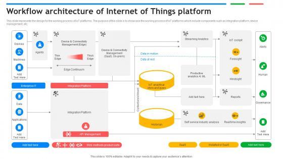 This slide represents the design for the working process of IoT platforms. The purpose of this slide is to showcase the working process of IoT platforms which include components such as integration platform, device management, etc. Whether you have daily or monthly meetings, a brilliant presentation is necessary. Workflow Architecture Of Internet Of Things Platform Exploring Google Cloud IoT Platform can be your best option for delivering a presentation. Represent everything in detail using Workflow Architecture Of Internet Of Things Platform Exploring Google Cloud IoT Platform and make yourself stand out in meetings. The template is versatile and follows a structure that will cater to your requirements. All the templates prepared by Slidegeeks are easy to download and edit. Our research experts have taken care of the corporate themes as well. So, give it a try and see the results. This slide represents the design for the working process of IoT platforms. The purpose of this slide is to showcase the working process of IoT platforms which include components such as integration platform, device management, etc.