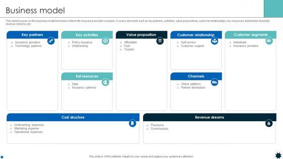 This slide focuses on the business model framework of term life insurance provider company. It covers elements such as key partners, activities, value propositions, customer relationships, key resources, distribution channels, revenue streams, etc. Boost your pitch with our creative Business Model Life Coverage Platform Pitch Deck Deliver an awe-inspiring pitch that will mesmerize everyone. Using these presentation templates you will surely catch everyones attention. You can browse the ppts collection on our website. We have researchers who are experts at creating the right content for the templates. So you do not have to invest time in any additional work. Just grab the template now and use them. This slide focuses on the business model framework of term life insurance provider company. It covers elements such as key partners, activities, value propositions, customer relationships, key resources, distribution channels, revenue streams, etc.