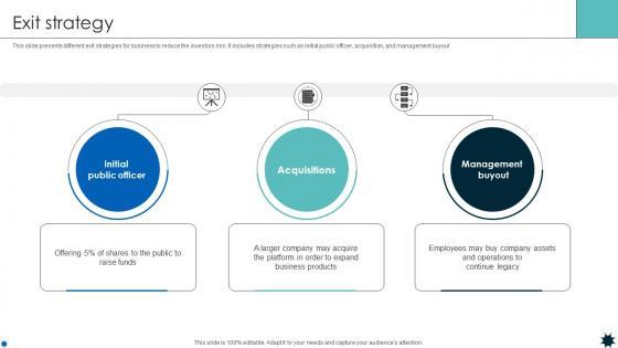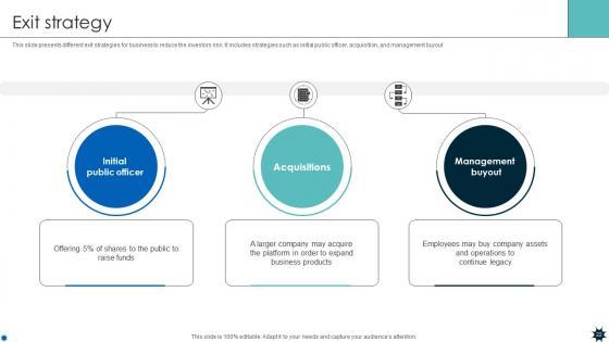 This slide presents different exit strategies for business to reduce the investors risk. It includes strategies such as initial public officer, acquisition, and management buyout From laying roadmaps to briefing everything in detail, our templates are perfect for you. You can set the stage with your presentation slides. All you have to do is download these easy-to-edit and customizable templates. Exit Strategy Life Coverage Platform Pitch Deck will help you deliver an outstanding performance that everyone would remember and praise you for. Do download this presentation today. This slide presents different exit strategies for business to reduce the investors risk. It includes strategies such as initial public officer, acquisition, and management buyout