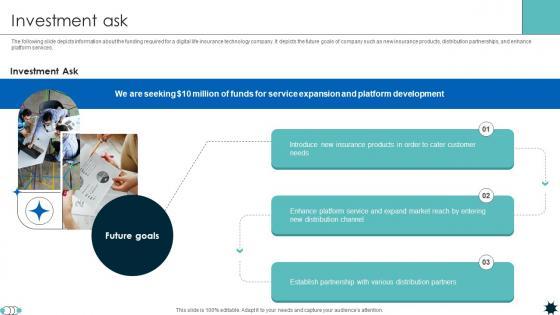 The following slide depicts information about the funding required for a digital life insurance technology company. It depicts the future goals of company such as new insurance products, distribution partnerships, and enhance platform services. Find highly impressive Investment Ask Life Coverage Platform Pitch Deck on Slidegeeks to deliver a meaningful presentation. You can save an ample amount of time using these presentation templates. No need to worry to prepare everything from scratch because Slidegeeks experts have already done a huge research and work for you. You need to download Investment Ask Life Coverage Platform Pitch Deck for your upcoming presentation. All the presentation templates are 100 percent editable and you can change the color and personalize the content accordingly. Download now The following slide depicts information about the funding required for a digital life insurance technology company. It depicts the future goals of company such as new insurance products, distribution partnerships, and enhance platform services.