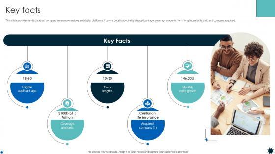 This slide provides key facts about company insurance services and digital platforms. It covers details about eligible applicant age, coverage amounts, term lengths, website visit, and company acquired. If your project calls for a presentation, then Slidegeeks is your go-to partner because we have professionally designed, easy-to-edit templates that are perfect for any presentation. After downloading, you can easily edit Key Facts Life Coverage Platform Pitch Deck and make the changes accordingly. You can rearrange slides or fill them with different images. Check out all the handy templates This slide provides key facts about company insurance services and digital platforms. It covers details about eligible applicant age, coverage amounts, term lengths, website visit, and company acquired.