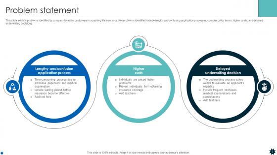 This slide exhibits problems identified by company faced by customers in acquiring life insurance. Key problems identified include lengthy and confusing application processes, complex policy terms, higher costs, and delayed underwriting decisions. Formulating a presentation can take up a lot of effort and time, so the content and message should always be the primary focus. The visuals of the PowerPoint can enhance the presenters message, so our Problem Statement Life Coverage Platform Pitch Deck was created to help save time. Instead of worrying about the design, the presenter can concentrate on the message while our designers work on creating the ideal templates for whatever situation is needed. Slidegeeks has experts for everything from amazing designs to valuable content, we have put everything into Problem Statement Life Coverage Platform Pitch Deck This slide exhibits problems identified by company faced by customers in acquiring life insurance. Key problems identified include lengthy and confusing application processes, complex policy terms, higher costs, and delayed underwriting decisions.