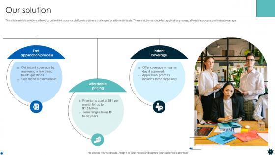 This slide covers the organizational structure of firm that demonstrates current expertise and operational framework. It includes roles such as founder and chief executive officer, chief distribution officer, chief finance officer chief insurance officer, etc. Make sure to capture your audiences attention in your business displays with our gratis customizable Our Solution Life Coverage Platform Pitch Deck These are great for business strategies, office conferences, capital raising or task suggestions. If you desire to acquire more customers for your tech business and ensure they stay satisfied, create your own sales presentation with these plain slides. This slide covers the organizational structure of firm that demonstrates current expertise and operational framework. It includes roles such as founder and chief executive officer, chief distribution officer, chief finance officer chief insurance officer, etc.