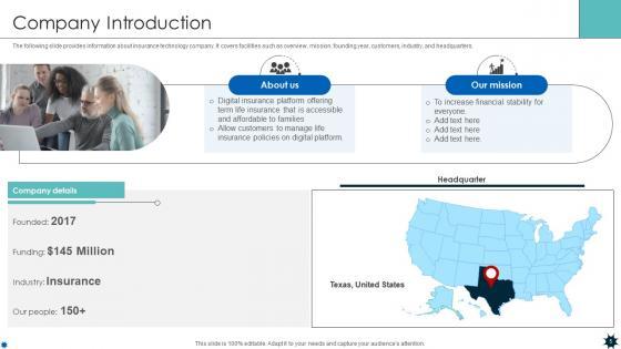 The following slide provides information about insurance technology company. It covers facilities such as overview, mission, founding year, customers, industry, and headquarters. Slidegeeks is one of the best resources for PowerPoint templates. You can download easily and regulate Company Introduction Life Coverage Platform Pitch Deck for your personal presentations from our wonderful collection. A few clicks is all it takes to discover and get the most relevant and appropriate templates. Use our Templates to add a unique zing and appeal to your presentation and meetings. All the slides are easy to edit and you can use them even for advertisement purposes. The following slide provides information about insurance technology company. It covers facilities such as overview, mission, founding year, customers, industry, and headquarters.