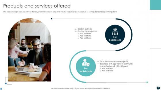 This slide includes products and services offered by a term life insurance company. It includes products for businesses such as online platform, and data solution platform. Coming up with a presentation necessitates that the majority of the effort goes into the content and the message you intend to convey. The visuals of a PowerPoint presentation can only be effective if it supplements and supports the story that is being told. Keeping this in mind our experts created Products And Services Offered Life Coverage Platform Pitch Deck to reduce the time that goes into designing the presentation. This way, you can concentrate on the message while our designers take care of providing you with the right template for the situation. This slide includes products and services offered by a term life insurance company. It includes products for businesses such as online platform, and data solution platform.