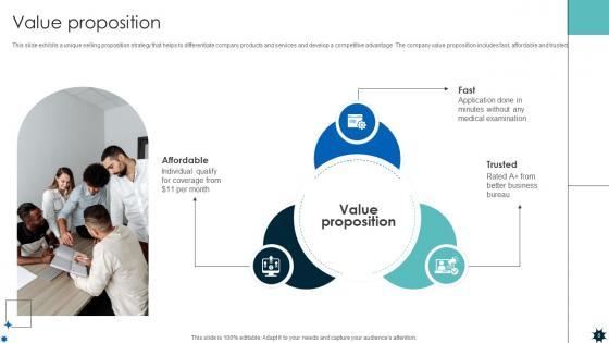 This slide exhibits a unique selling proposition strategy that helps to differentiate company products and services and develop a competitive advantage. The company value proposition includes fast, affordable and trusted. Explore a selection of the finest Value Proposition Life Coverage Platform Pitch Deck here. With a plethora of professionally designed and pre-made slide templates, you can quickly and easily find the right one for your upcoming presentation. You can use our Value Proposition Life Coverage Platform Pitch Deck to effectively convey your message to a wider audience. Slidegeeks has done a lot of research before preparing these presentation templates. The content can be personalized and the slides are highly editable. Grab templates today from Slidegeeks. This slide exhibits a unique selling proposition strategy that helps to differentiate company products and services and develop a competitive advantage. The company value proposition includes fast, affordable and trusted.