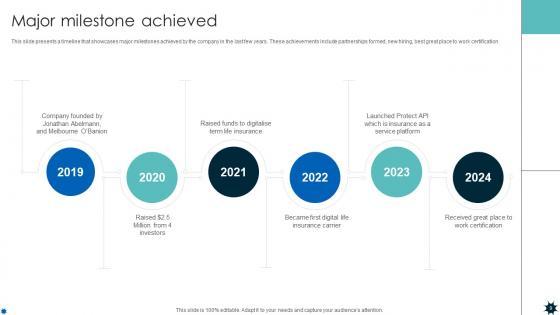 This slide presents a timeline that showcases major milestones achieved by the company in the last few years. These achievements include partnerships formed, new hiring, best great place to work certification If you are looking for a format to display your unique thoughts, then the professionally designed Major Milestone Achieved Life Coverage Platform Pitch Deck is the one for you. You can use it as a Google Slides template or a PowerPoint template. Incorporate impressive visuals, symbols, images, and other charts. Modify or reorganize the text boxes as you desire. Experiment with shade schemes and font pairings. Alter, share or cooperate with other people on your work. Download Major Milestone Achieved Life Coverage Platform Pitch Deck and find out how to give a successful presentation. Present a perfect display to your team and make your presentation unforgettable. This slide presents a timeline that showcases major milestones achieved by the company in the last few years. These achievements include partnerships formed, new hiring, best great place to work certification