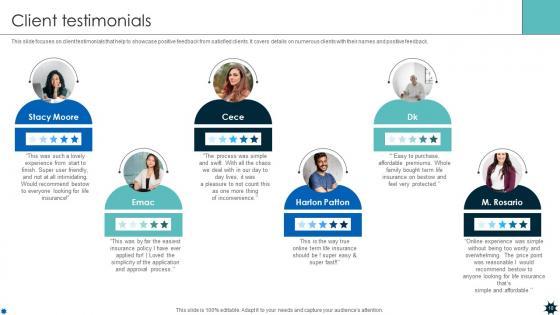 This slide focuses on client testimonials that help to showcase positive feedback from satisfied clients. It covers details on numerous clients with their names and positive feedback. Create an editable Client Testimonials Life Coverage Platform Pitch Deck that communicates your idea and engages your audience. Whether you are presenting a business or an educational presentation, pre-designed presentation templates help save time. Client Testimonials Life Coverage Platform Pitch Deck is highly customizable and very easy to edit, covering many different styles from creative to business presentations. Slidegeeks has creative team members who have crafted amazing templates. So, go and get them without any delay. This slide focuses on client testimonials that help to showcase positive feedback from satisfied clients. It covers details on numerous clients with their names and positive feedback.