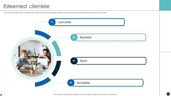This slide emphasizes the successful partnerships and trusted relationships that the company has established with notable clients and customers. Get a simple yet stunning designed Esteemed Clientele Life Coverage Platform Pitch Deck It is the best one to establish the tone in your meetings. It is an excellent way to make your presentations highly effective. So, download this PPT today from Slidegeeks and see the positive impacts. Our easy-to-edit Esteemed Clientele Life Coverage Platform Pitch Deck can be your go-to option for all upcoming conferences and meetings. So, what are you waiting for Grab this template today. This slide emphasizes the successful partnerships and trusted relationships that the company has established with notable clients and customers.