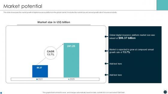 This slide showcases the market growth of digital insurance platforms in the global market. It includes the market size and annual growth rate of insurance industry. Are you in need of a template that can accommodate all of your creative concepts This one is crafted professionally and can be altered to fit any style. Use it with Google Slides or PowerPoint. Include striking photographs, symbols, depictions, and other visuals. Fill, move around, or remove text boxes as desired. Test out color palettes and font mixtures. Edit and save your work, or work with colleagues. Download Market Potential Life Coverage Platform Pitch Deck and observe how to make your presentation outstanding. Give an impeccable presentation to your group and make your presentation unforgettable. This slide showcases the market growth of digital insurance platforms in the global market. It includes the market size and annual growth rate of insurance industry.