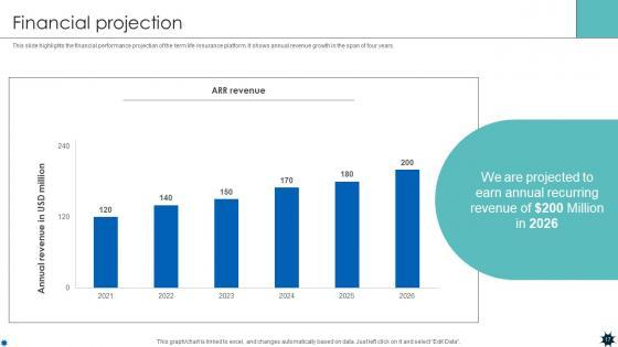 This slide highlights the financial performance projection of the term life insurance platform. It shows annual revenue growth in the span of four years. Slidegeeks is here to make your presentations a breeze with Financial Projection Life Coverage Platform Pitch Deck With our easy-to-use and customizable templates, you can focus on delivering your ideas rather than worrying about formatting. With a variety of designs to choose from, you are sure to find one that suits your needs. And with animations and unique photos, illustrations, and fonts, you can make your presentation pop. So whether you are giving a sales pitch or presenting to the board, make sure to check out Slidegeeks first This slide highlights the financial performance projection of the term life insurance platform. It shows annual revenue growth in the span of four years.