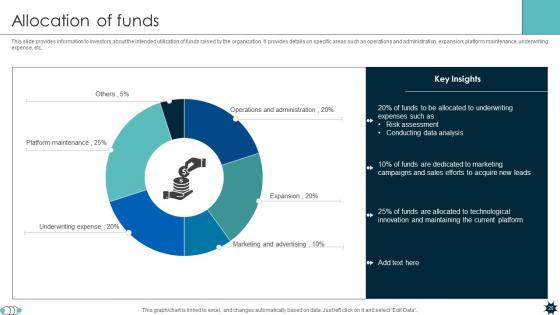 This slide provides information to investors about the intended utilization of funds raised by the organization. It provides details on specific areas such as operations and administration, expansion, platform maintenance, underwriting expense, etc. Find a pre-designed and impeccable Allocation Of Funds Life Coverage Platform Pitch Deck The templates can ace your presentation without additional effort. You can download these easy-to-edit presentation templates to make your presentation stand out from others. So, what are you waiting for Download the template from Slidegeeks today and give a unique touch to your presentation. This slide provides information to investors about the intended utilization of funds raised by the organization. It provides details on specific areas such as operations and administration, expansion, platform maintenance, underwriting expense, etc.