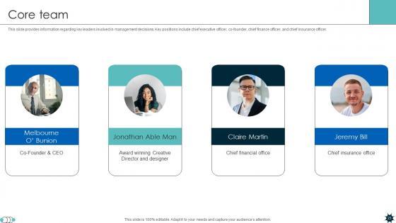 This slide provides information regarding key leaders involved in management decisions. Key positions include chief executive officer, co-founder, chief finance officer, and chief insurance officer. Do you have to make sure that everyone on your team knows about any specific topic I yes, then you should give Core Team Life Coverage Platform Pitch Deck a try. Our experts have put a lot of knowledge and effort into creating this impeccable Core Team Life Coverage Platform Pitch Deck You can use this template for your upcoming presentations, as the slides are perfect to represent even the tiniest detail. You can download these templates from the Slidegeeks website and these are easy to edit. So grab these today This slide provides information regarding key leaders involved in management decisions. Key positions include chief executive officer, co-founder, chief finance officer, and chief insurance officer.