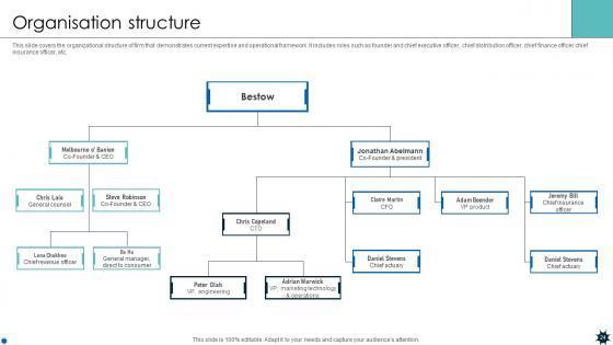 This slide covers the organizational structure of firm that demonstrates current expertise and operational framework. It includes roles such as founder and chief executive officer, chief distribution officer, chief finance officer chief insurance officer, etc. Crafting an eye-catching presentation has never been more straightforward. Let your presentation shine with this tasteful yet straightforward Organisation Structure Life Coverage Platform Pitch Deck template. It offers a minimalistic and classy look that is great for making a statement. The colors have been employed intelligently to add a bit of playfulness while still remaining professional. Construct the ideal Organisation Structure Life Coverage Platform Pitch Deck that effortlessly grabs the attention of your audience Begin now and be certain to wow your customers This slide covers the organizational structure of firm that demonstrates current expertise and operational framework. It includes roles such as founder and chief executive officer, chief distribution officer, chief finance officer chief insurance officer, etc.