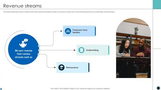 This slide exhibits the revenue model of a term life insurance-providing company. Insurance company earns revenue through premiums, underwriting, and reinsurance. This modern and well-arranged Revenue Streams Life Coverage Platform Pitch Deck provides lots of creative possibilities. It is very simple to customize and edit with the Powerpoint Software. Just drag and drop your pictures into the shapes. All facets of this template can be edited with Powerpoint, no extra software is necessary. Add your own material, put your images in the places assigned for them, adjust the colors, and then you can show your slides to the world, with an animated slide included. This slide exhibits the revenue model of a term life insurance-providing company. Insurance company earns revenue through premiums, underwriting, and reinsurance.