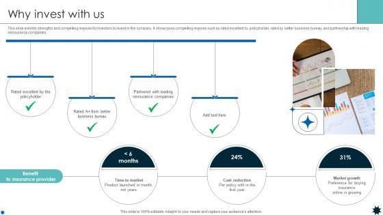 This slide exhibits strengths and compelling reasons for investors to invest in the company. It showcases compelling reasons such as rated excellent by policyholder, rated by better business bureau, and partnership with leading reinsurance companies. The best PPT templates are a great way to save time, energy, and resources. Slidegeeks have 100 percent editable powerpoint slides making them incredibly versatile. With these quality presentation templates, you can create a captivating and memorable presentation by combining visually appealing slides and effectively communicating your message. Download Why Invest With Us Life Coverage Platform Pitch Deck from Slidegeeks and deliver a wonderful presentation. This slide exhibits strengths and compelling reasons for investors to invest in the company. It showcases compelling reasons such as rated excellent by policyholder, rated by better business bureau, and partnership with leading reinsurance companies.