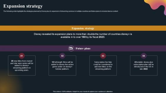 The following slide highlights the strategies planned by Disney plus to expansion of streaming services in multiple countries and future plans to include diverse content. Find a pre designed and impeccable Digital Media Streaming Platform Company Profile Expansion Strategy Portrait PDF. The templates can ace your presentation without additional effort. You can download these easy to edit presentation templates to make your presentation stand out from others. So, what are you waiting for Download the template from Slidegeeks today and give a unique touch to your presentation.
