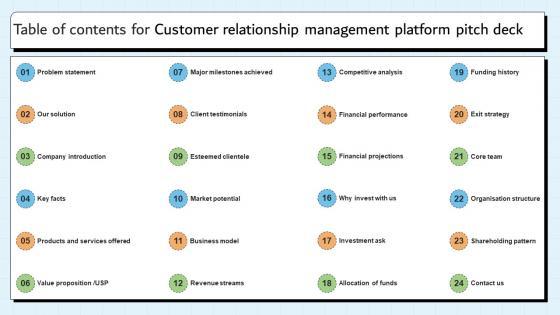 Welcome to our selection of the Table Of Contents For Customer Relationship Management Platform Pitch Deck. These are designed to help you showcase your creativity and bring your sphere to life. Planning and Innovation are essential for any business that is just starting out. This collection contains the designs that you need for your everyday presentations. All of our PowerPoints are 100 percent editable, so you can customize them to suit your needs. This multi-purpose template can be used in various situations. Grab these presentation templates today. Our Table Of Contents For Customer Relationship Management Platform Pitch Deck are topically designed to provide an attractive backdrop to any subject. Use them to look like a presentation pro.