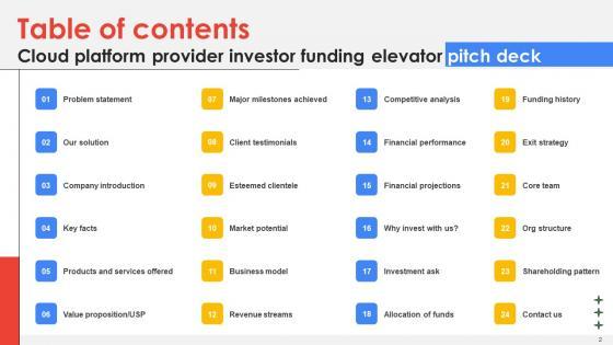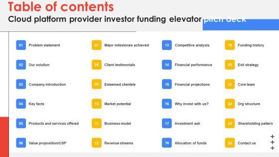 This Table Of Contents Cloud Platform Provider Investor Funding Elevator Pitch Deck Demonstration Pdf is perfect for any presentation, be it in front of clients or colleagues. It is a versatile and stylish solution for organizing your meetings. The Table Of Contents Cloud Platform Provider Investor Funding Elevator Pitch Deck Demonstration Pdf features a modern design for your presentation meetings. The adjustable and customizable slides provide unlimited possibilities for acing up your presentation. Slidegeeks has done all the homework before launching the product for you. So, do not wait, grab the presentation templates today Our Table Of Contents Cloud Platform Provider Investor Funding Elevator Pitch Deck Demonstration Pdf are topically designed to provide an attractive backdrop to any subject. Use them to look like a presentation pro.