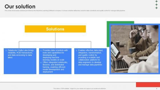 This slide showcases solutions provided by the Machine Learning Software company. It shows solution delta lake, tools for data scientists and quality control and manage data pipeline. Crafting an eye-catching presentation has never been more straightforward. Let your presentation shine with this tasteful yet straightforward Our Solution Cloud Platform Provider Investor Funding Elevator Professional Pdf template. It offers a minimalistic and classy look that is great for making a statement. The colors have been employed intelligently to add a bit of playfulness while still remaining professional. Construct the ideal Our Solution Cloud Platform Provider Investor Funding Elevator Professional Pdf that effortlessly grabs the attention of your audience Begin now and be certain to wow your customers This slide showcases solutions provided by the Machine Learning Software company. It shows solution delta lake, tools for data scientists and quality control and manage data pipeline.