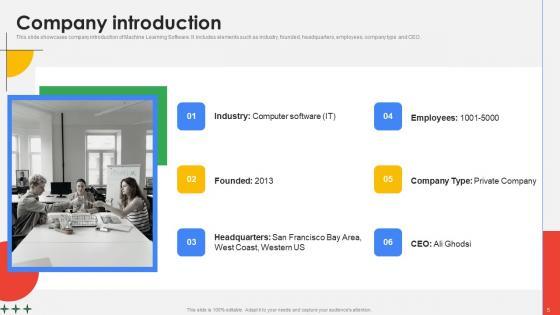 This slide showcases company introduction of Machine Learning Software. It includes elements such as industry, founded, headquarters, employees, company type and CEO. Slidegeeks is one of the best resources for PowerPoint templates. You can download easily and regulate Company Introduction Cloud Platform Provider Investor Funding Elevator Demonstration Pdf for your personal presentations from our wonderful collection. A few clicks is all it takes to discover and get the most relevant and appropriate templates. Use our Templates to add a unique zing and appeal to your presentation and meetings. All the slides are easy to edit and you can use them even for advertisement purposes. This slide showcases company introduction of Machine Learning Software. It includes elements such as industry, founded, headquarters, employees, company type and CEO.