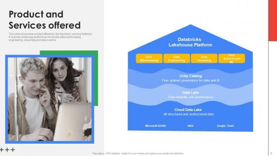 This slide showcases product offered by the Machine Learning Software. It includes lakehouse platform as it includes data warehousing, engineering, streaming and data science. Formulating a presentation can take up a lot of effort and time, so the content and message should always be the primary focus. The visuals of the PowerPoint can enhance the presenters message, so our Product And Services Offered Cloud Platform Provider Investor Funding Elevator Background Pdf was created to help save time. Instead of worrying about the design, the presenter can concentrate on the message while our designers work on creating the ideal templates for whatever situation is needed. Slidegeeks has experts for everything from amazing designs to valuable content, we have put everything into Product And Services Offered Cloud Platform Provider Investor Funding Elevator Background Pdf This slide showcases product offered by the Machine Learning Software. It includes lakehouse platform as it includes data warehousing, engineering, streaming and data science.