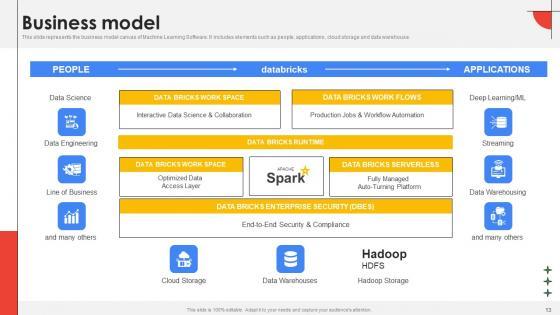 This slide represents the business model canvas of Machine Learning Software. It includes elements such as people, applications , cloud storage and data warehouse. Boost your pitch with our creative Business Model Cloud Platform Provider Investor Funding Elevator Portrait Pdf. Deliver an awe-inspiring pitch that will mesmerize everyone. Using these presentation templates you will surely catch everyones attention. You can browse the ppts collection on our website. We have researchers who are experts at creating the right content for the templates. So you do not have to invest time in any additional work. Just grab the template now and use them. This slide represents the business model canvas of Machine Learning Software. It includes elements such as people, applications , cloud storage and data warehouse.