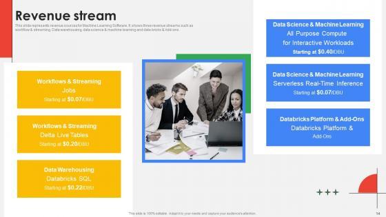 This slide represents revenue sources for Machine Learning Software. It shows three revenue streams such as workflow and streaming, Data warehousing, data science and machine learning and data bricks and Add-ons. Coming up with a presentation necessitates that the majority of the effort goes into the content and the message you intend to convey. The visuals of a PowerPoint presentation can only be effective if it supplements and supports the story that is being told. Keeping this in mind our experts created Revenue Stream Cloud Platform Provider Investor Funding Elevator Portrait Pdf to reduce the time that goes into designing the presentation. This way, you can concentrate on the message while our designers take care of providing you with the right template for the situation. This slide represents revenue sources for Machine Learning Software. It shows three revenue streams such as workflow and streaming, Data warehousing, data science and machine learning and data bricks and Add-ons.