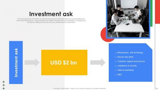 This slide represents information about the funding requirement for the Machine Learning Software for technology infrastructure, content development, platform development and maintenance, marketing and advertising, staffing and human resources, infrastructure and operations. Whether you have daily or monthly meetings, a brilliant presentation is necessary. Investment Ask Cloud Platform Provider Investor Funding Elevator Diagrams Pdf can be your best option for delivering a presentation. Represent everything in detail using Investment Ask Cloud Platform Provider Investor Funding Elevator Diagrams Pdf and make yourself stand out in meetings. The template is versatile and follows a structure that will cater to your requirements. All the templates prepared by Slidegeeks are easy to download and edit. Our research experts have taken care of the corporate themes as well. So, give it a try and see the results. This slide represents information about the funding requirement for the Machine Learning Software for technology infrastructure, content development, platform development and maintenance, marketing and advertising, staffing and human resources, infrastructure and operations.