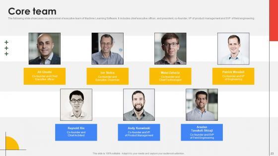 The following slide showcases key personnel of executive team of Machine Learning Software. It includes chief executive officer, and president, co-founder, VP of product management and SVP of field engineering. There are so many reasons you need a Core Team Cloud Platform Provider Investor Funding Elevator Graphics Pdf. The first reason is you can not spend time making everything from scratch, Thus, Slidegeeks has made presentation templates for you too. You can easily download these templates from our website easily. The following slide showcases key personnel of executive team of Machine Learning Software. It includes chief executive officer, and president, co-founder, VP of product management and SVP of field engineering.