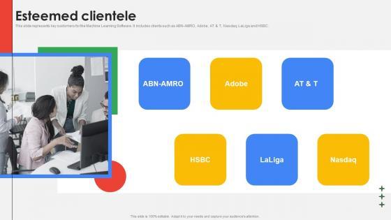 This slide represents key customers for the Machine Learning Software. It includes clients such as ABN-AMRO, Adobe, AT and T, Nasdaq, LaLiga and HSBC. Do you have to make sure that everyone on your team knows about any specific topic I yes, then you should give Esteemed Clientele Cloud Platform Provider Investor Funding Elevator Elements Pdf a try. Our experts have put a lot of knowledge and effort into creating this impeccable Esteemed Clientele Cloud Platform Provider Investor Funding Elevator Elements Pdf. You can use this template for your upcoming presentations, as the slides are perfect to represent even the tiniest detail. You can download these templates from the Slidegeeks website and these are easy to edit. So grab these today This slide represents key customers for the Machine Learning Software. It includes clients such as ABN-AMRO, Adobe, AT and T, Nasdaq, LaLiga and HSBC.