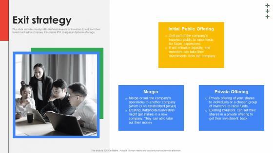 The slide provides most profitable feasible ways for investors to exit from their investment in the company. It includes IPO, merger and private offerings. Get a simple yet stunning designed Exit Strategy Cloud Platform Provider Investor Funding Elevator Elements Pdf. It is the best one to establish the tone in your meetings. It is an excellent way to make your presentations highly effective. So, download this PPT today from Slidegeeks and see the positive impacts. Our easy-to-edit Exit Strategy Cloud Platform Provider Investor Funding Elevator Elements Pdfcan be your go-to option for all upcoming conferences and meetings. So, what are you waiting for Grab this template today. The slide provides most profitable feasible ways for investors to exit from their investment in the company. It includes IPO, merger and private offerings.