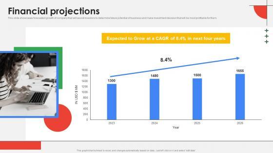 This slide showcases forecasted growth of company that will assist investors to determine future potential of business and make investment decision that will be most profitable for them. Present like a pro with Financial Projections Cloud Platform Provider Investor Funding Elevator Template Pdf Create beautiful presentations together with your team, using our easy-to-use presentation slides. Share your ideas in real-time and make changes on the fly by downloading our templates. So whether you are in the office, on the go, or in a remote location, you can stay in sync with your team and present your ideas with confidence. With Slidegeeks presentation got a whole lot easier. Grab these presentations today. This slide showcases forecasted growth of company that will assist investors to determine future potential of business and make investment decision that will be most profitable for them.