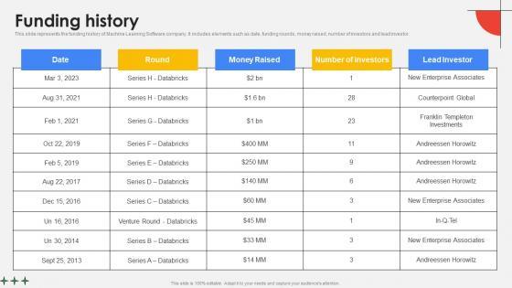 This slide represents the funding history of Machine Learning Software company. It includes elements such as date, funding rounds, money raised, number of investors and lead investor. Slidegeeks is here to make your presentations a breeze with Funding History Cloud Platform Provider Investor Funding Elevator Themes Pdf With our easy-to-use and customizable templates, you can focus on delivering your ideas rather than worrying about formatting. With a variety of designs to choose from, you are sure to find one that suits your needs. And with animations and unique photos, illustrations, and fonts, you can make your presentation pop. So whether you are giving a sales pitch or presenting to the board, make sure to check out Slidegeeks first This slide represents the funding history of Machine Learning Software company. It includes elements such as date, funding rounds, money raised, number of investors and lead investor.
