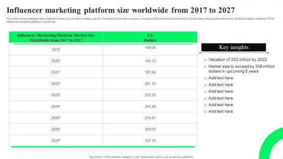 This slide shows statistical data related to market size of platform widely used by marketers to promote companys brands and its products and services by collaborating with popular influencers. It includes details related to TikTok influencer marketing platform market size. Make sure to capture your audiences attention in your business displays with our gratis customizable Influencer Marketing Platform Size TikTok Advertising Strategies To Provide Effective Rules Pdf. These are great for business strategies, office conferences, capital raising or task suggestions. If you desire to acquire more customers for your tech business and ensure they stay satisfied, create your own sales presentation with these plain slides. This slide shows statistical data related to market size of platform widely used by marketers to promote companys brands and its products and services by collaborating with popular influencers. It includes details related to TikTok influencer marketing platform market size.