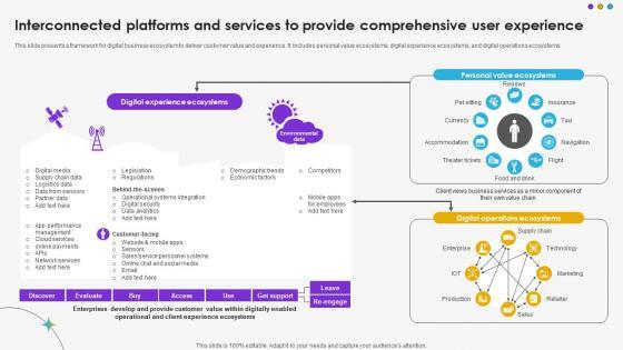 This slide presents a framework for digital business ecosystem to deliver customer value and experience. It includes personal value ecosystems, digital experience ecosystems, and digital operations ecosystems.If your project calls for a presentation, then Slidegeeks is your go-to partner because we have professionally designed, easy-to-edit templates that are perfect for any presentation. After downloading, you can easily edit Interconnected Platforms And Services To Provide Comprehensive User Experience DT SS V and make the changes accordingly. You can rearrange slides or fill them with different images. Check out all the handy templates This slide presents a framework for digital business ecosystem to deliver customer value and experience. It includes personal value ecosystems, digital experience ecosystems, and digital operations ecosystems.