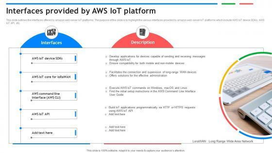 This slide outlines the interfaces offered by amazon web server IoT platforms. The purpose of this slide is to highlight the various interfaces provided by amazon web server IoT platforms which include AWS IoT device SDKs, AWS IoT API, etc. This modern and well arranged Interfaces Provided By Aws IoT Platform Exploring Google Cloud IoT Platform provides lots of creative possibilities. It is very simple to customize and edit with the Powerpoint Software. Just drag and drop your pictures into the shapes. All facets of this template can be edited with Powerpoint, no extra software is necessary. Add your own material, put your images in the places assigned for them, adjust the colors, and then you can show your slides to the world, with an animated slide included. This slide outlines the interfaces offered by amazon web server IoT platforms. The purpose of this slide is to highlight the various interfaces provided by amazon web server IoT platforms which include AWS IoT device SDKs, AWS IoT API, etc.