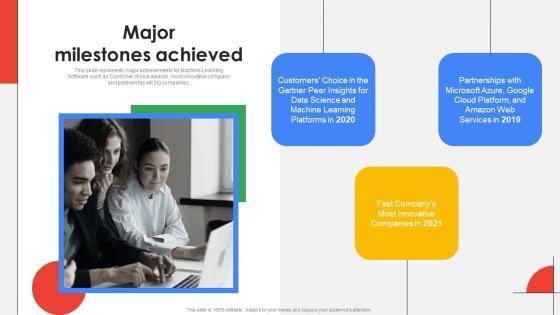 This slide represents major achievements for Machine Learning Software such as Customer choice awards, most innovative company and partnership wit big companies. If your project calls for a presentation, then Slidegeeks is your go-to partner because we have professionally designed, easy-to-edit templates that are perfect for any presentation. After downloading, you can easily edit Major Milestones Achieved Cloud Platform Provider Investor Funding Elevator Themes Pdf and make the changes accordingly. You can rearrange slides or fill them with different images. Check out all the handy templates This slide represents major achievements for Machine Learning Software such as Customer choice awards, most innovative company and partnership wit big companies.