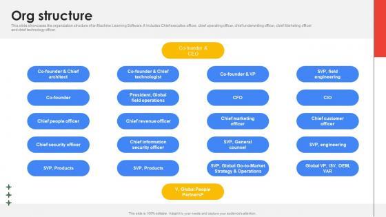 This slide showcases the organization structure of an Machine Learning Software. It includes Chief executive officer, chief operating officer, chief underwriting officer, chief Marketing officer and chief technology officer. Are you in need of a template that can accommodate all of your creative concepts This one is crafted professionally and can be altered to fit any style. Use it with Google Slides or PowerPoint. Include striking photographs, symbols, depictions, and other visuals. Fill, move around, or remove text boxes as desired. Test out color palettes and font mixtures. Edit and save your work, or work with colleagues. Download Org Structure Cloud Platform Provider Investor Funding Elevator Summary Pdf and observe how to make your presentation outstanding. Give an impeccable presentation to your group and make your presentation unforgettable. This slide showcases the organization structure of an Machine Learning Software. It includes Chief executive officer, chief operating officer, chief underwriting officer, chief Marketing officer and chief technology officer.