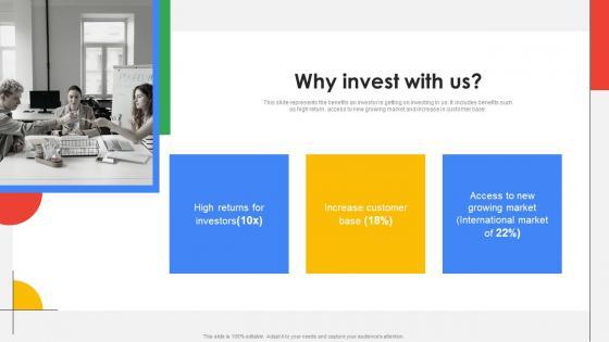 This slide represents the benefits an investor is getting on investing in us. It includes benefits such as high return, access to new growing market and increase in customer base. Explore a selection of the finest Why Invest With Us Cloud Platform Provider Investor Funding Elevator Portrait Pdf here. With a plethora of professionally designed and pre-made slide templates, you can quickly and easily find the right one for your upcoming presentation. You can use our Why Invest With Us Cloud Platform Provider Investor Funding Elevator Portrait Pdf to effectively convey your message to a wider audience. Slidegeeks has done a lot of research before preparing these presentation templates. The content can be personalized and the slides are highly editable. Grab templates today from Slidegeeks. This slide represents the benefits an investor is getting on investing in us. It includes benefits such as high return, access to new growing market and increase in customer base.