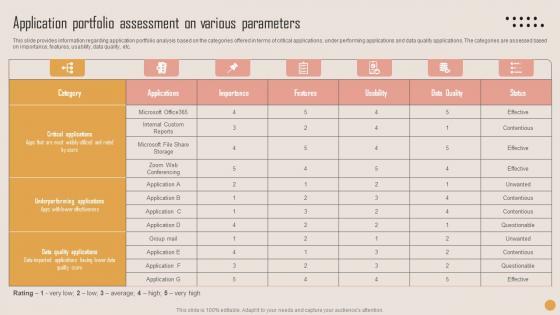 This slide provides information regarding application portfolio analysis based on the categories offered in terms of critical applications, under performing applications and data quality applications. The categories are assessed based on importance, features, usability, data quality, etc. There are so many reasons you need a Application Portfolio Assessment Playbook For Strategic Actions To Improve IT Performance Topics Pdf. The first reason is you can not spend time making everything from scratch, Thus, Slidegeeks has made presentation templates for you too. You can easily download these templates from our website easily. This slide provides information regarding application portfolio analysis based on the categories offered in terms of critical applications, under performing applications and data quality applications. The categories are assessed based on importance, features, usability, data quality, etc.