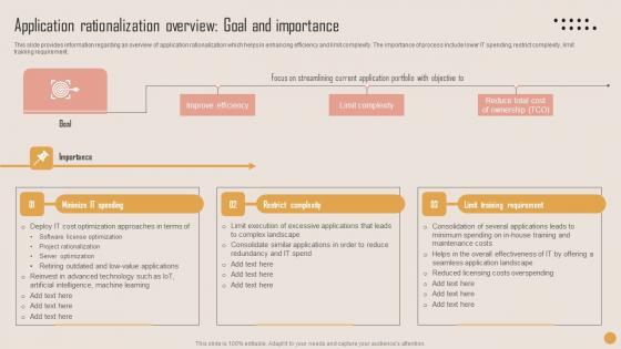 This slide provides information regarding an overview of application rationalization which helps in enhancing efficiency and limit complexity. The importance of process include lower IT spending, restrict complexity, limit training requirement. Do you have to make sure that everyone on your team knows about any specific topic I yes, then you should give Application Rationalization Overview Playbook For Strategic Actions To Improve IT Performance Guidelines Pdf a try. Our experts have put a lot of knowledge and effort into creating this impeccable Application Rationalization Overview Playbook For Strategic Actions To Improve IT Performance Guidelines Pdf. You can use this template for your upcoming presentations, as the slides are perfect to represent even the tiniest detail. You can download these templates from the Slidegeeks website and these are easy to edit. So grab these today This slide provides information regarding an overview of application rationalization which helps in enhancing efficiency and limit complexity. The importance of process include lower IT spending, restrict complexity, limit training requirement.