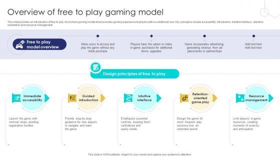 This slide provides an introduction of free to play blockchain gaming model which provides gaming experience to players with no additional cost. Key principles include accessibility, introduction, intuitive interface, retention orientation and resource management. Crafting an eye-catching presentation has never been more straightforward. Let your presentation shine with this tasteful yet straightforward Unlocking The Potential Of Overview Of Free To Play Gaming Model BCT SS V template. It offers a minimalistic and classy look that is great for making a statement. The colors have been employed intelligently to add a bit of playfulness while still remaining professional. Construct the ideal Unlocking The Potential Of Overview Of Free To Play Gaming Model BCT SS V that effortlessly grabs the attention of your audience Begin now and be certain to wow your customers This slide provides an introduction of free to play blockchain gaming model which provides gaming experience to players with no additional cost. Key principles include accessibility, introduction, intuitive interface, retention orientation and resource management.