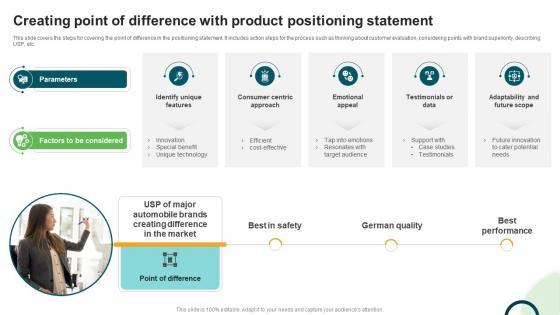 This slide covers the steps for covering the point of difference in the positioning statement. It includes action steps for the process such as thinking about customer evaluation, considering points with brand superiority, describing USP, etc. Slidegeeks is here to make your presentations a breeze with Positioning Techniques To Improve Create Point Of Difference With Positioning Statement Graphics PDF With our easy to-use and customizable templates, you can focus on delivering your ideas rather than worrying about formatting. With a variety of designs to choose from, you are sure to find one that suits your needs. And with animations and unique photos, illustrations, and fonts, you can make your presentation pop. So whether you are giving a sales pitch or presenting to the board, make sure to check out Slidegeeks first.